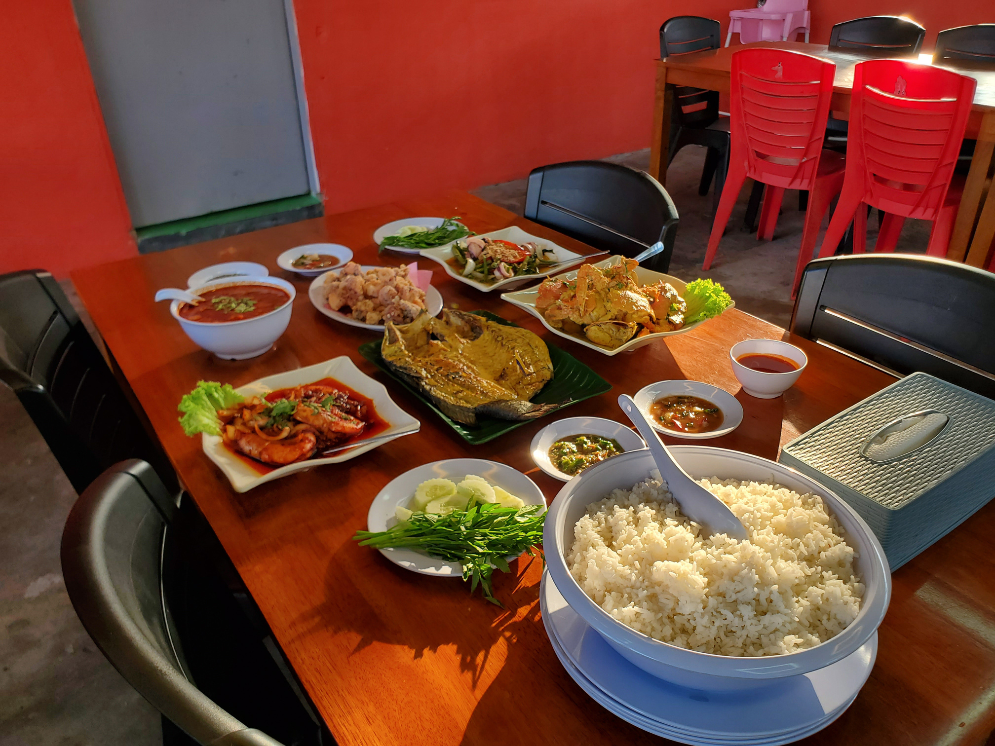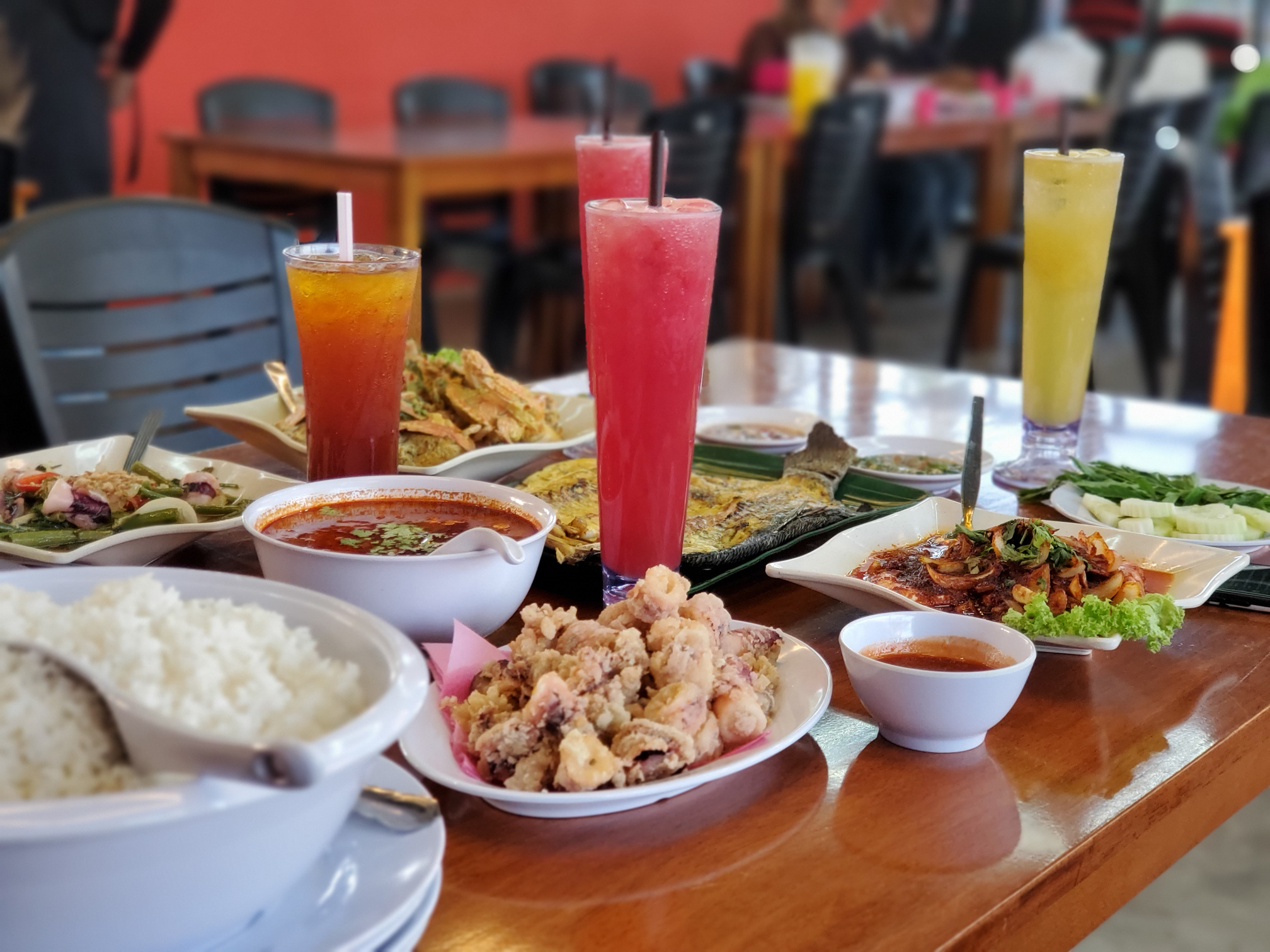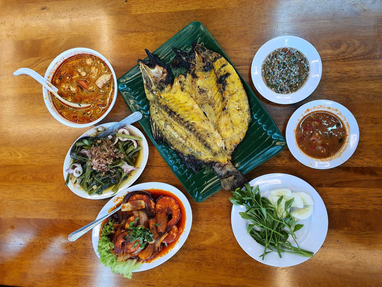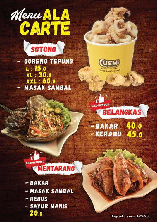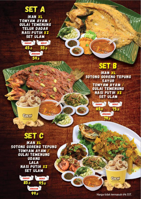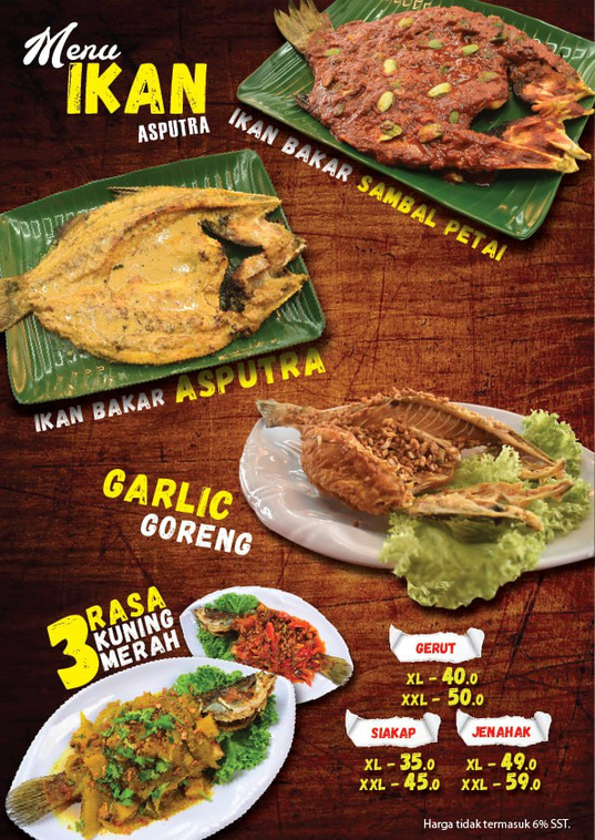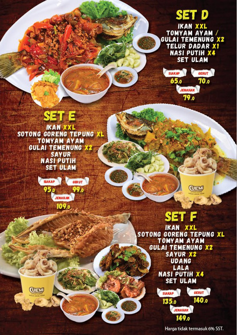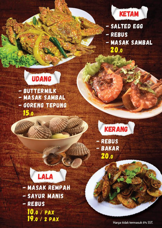 "When here several times. The food is very good and the price very reasonable. Normally took Set C (RM65) which include Siakap XL, fried squid flour, tomyam / gulai (can choose), lala shell, prawn (normally order fried butter style), kailan and herbs (ulam) + Sambal belacan. . U guys just add on rice and my recommendation..one jug of orange juice. Very very cheap, delicious and satiated."